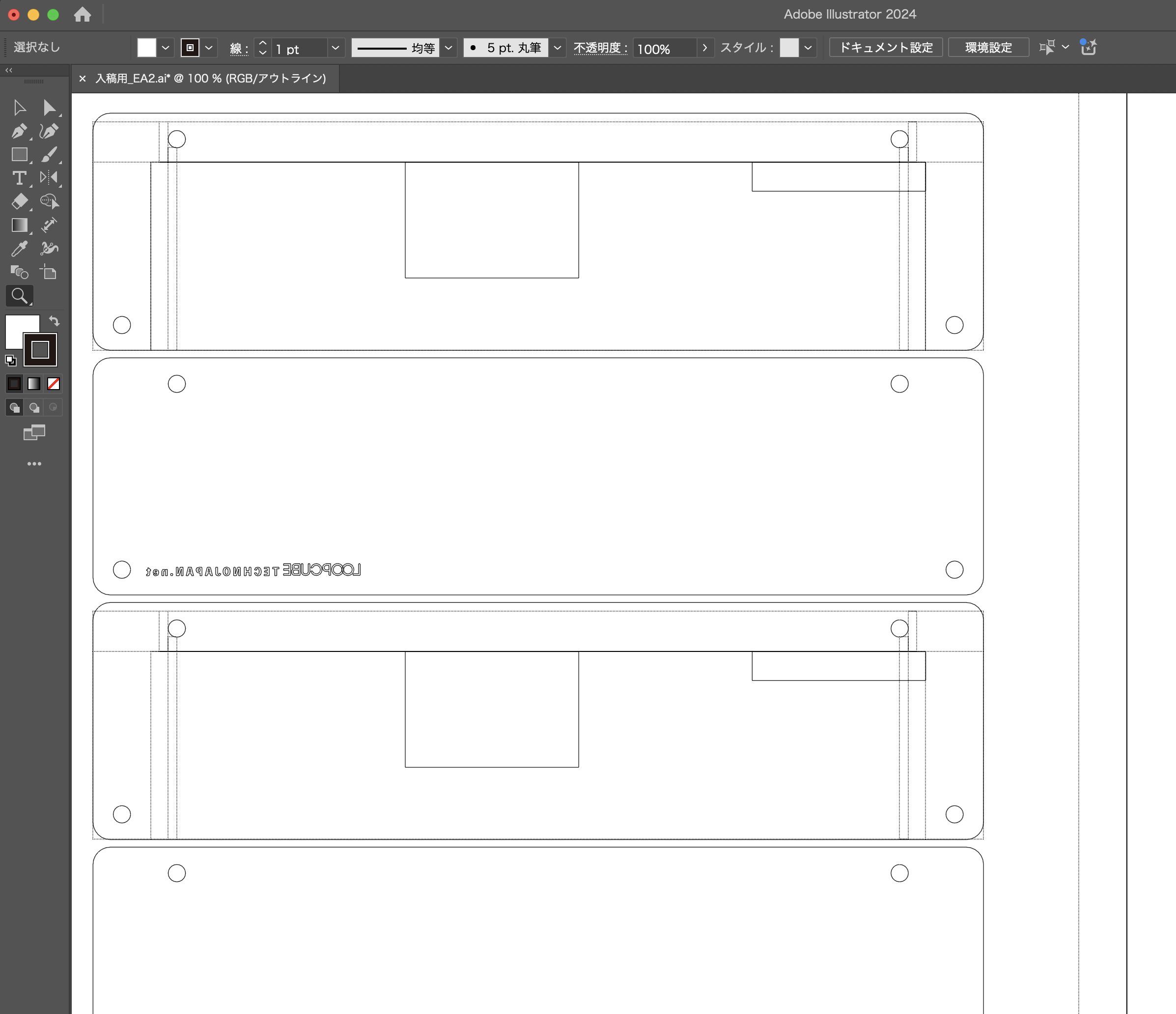 ネジ穴は上部2箇所が基板固定、下部2箇所は基板の外側に配置しています。黒い四角部分はボタンやコネクタ部分を窓にするためにカットする前提です。