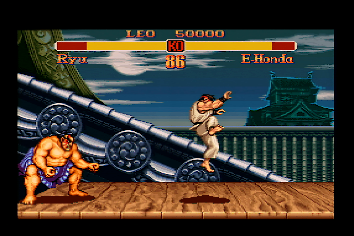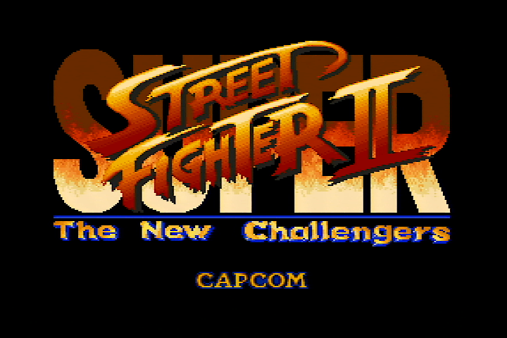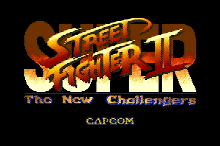 ロゴの大きな「SUPER」の"R"などを見るとクッキリとドットのカドが出ているので十分キレイな画質ではありますが、下の「CAPCOM」ロゴや「The New Challengers」の文字を見るとゴールドや黄色の文字色と青の囲み滲んでます。